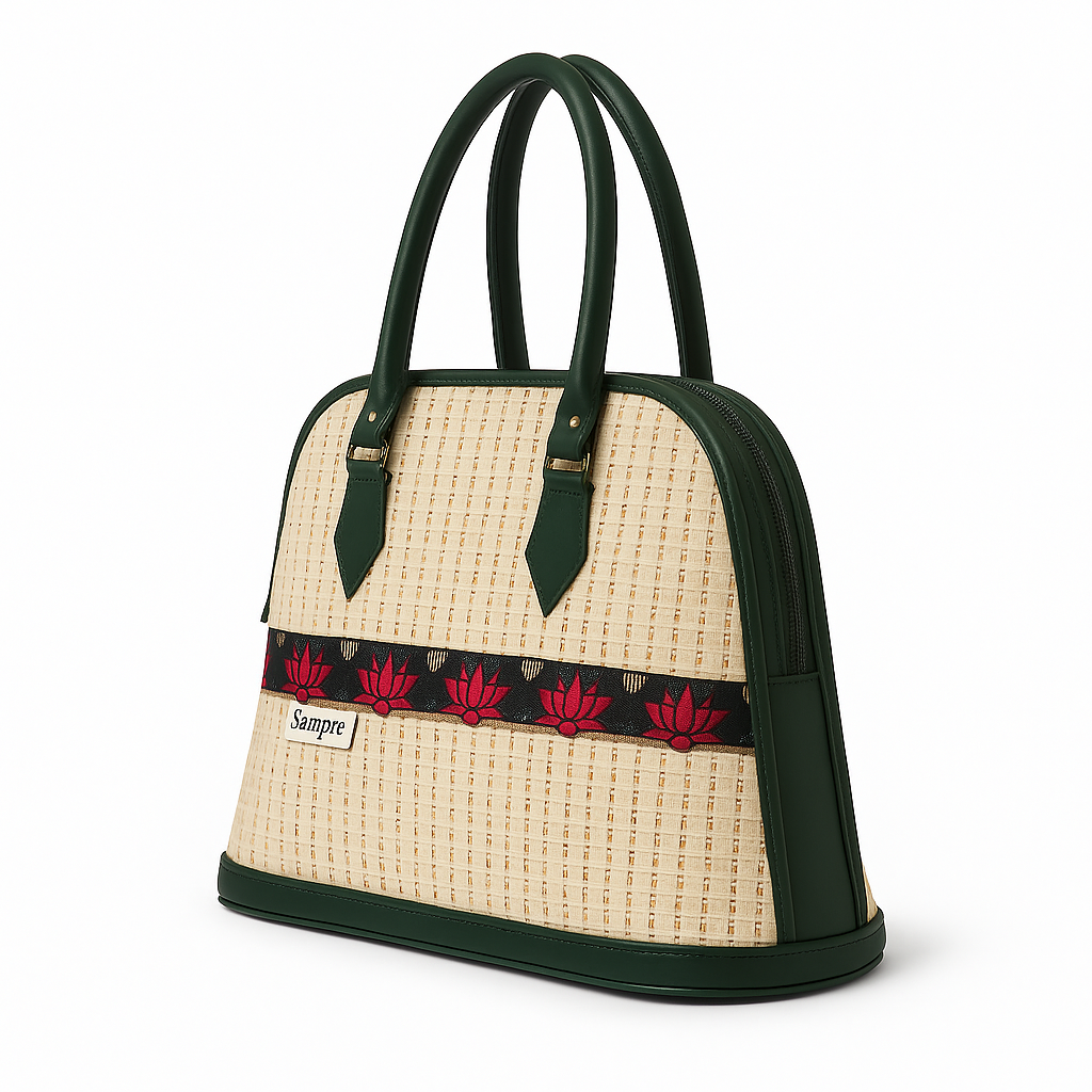 The Sampre series by CROCHÉ PARIS brings handcrafted crochet artistry into modern design. The Sampre Lotus Motif features a deep green trim contrasted with a delicate lotus-inspired crochet pattern, accented by PU leather for durability. Its lightweight yet spacious structure makes it perfect for workdays, festive occasions, travel, and everyday use. Styled in Paris and crafted in India, the Sampre series represents the CROCHÉ PARIS vision – bringing everyday luxury within reach.